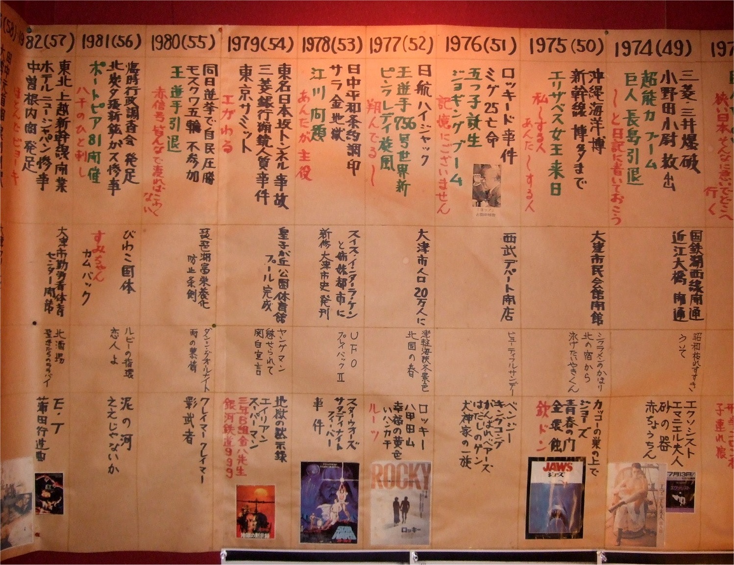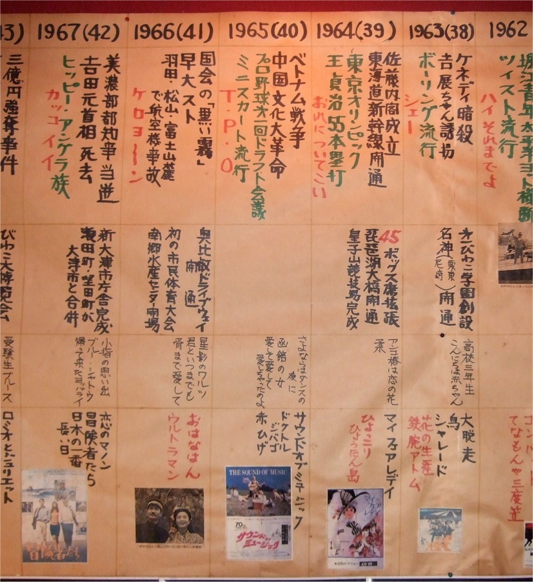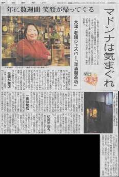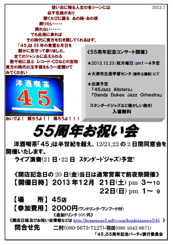 年表 1958(S33) 12月、45開店 1987 (S62)/12/4 開店30周年祝賀会 2008 (H20)/12/19-21 開店50周年同窓会 2013 (H25)/12/21-23 開店55周年お祝い会 2014 (H26)/10/18 初めて「大津ジャズフェスティバル」の会場になる 2018 (H30)/12/20-22 開店60周年お祝い会 |