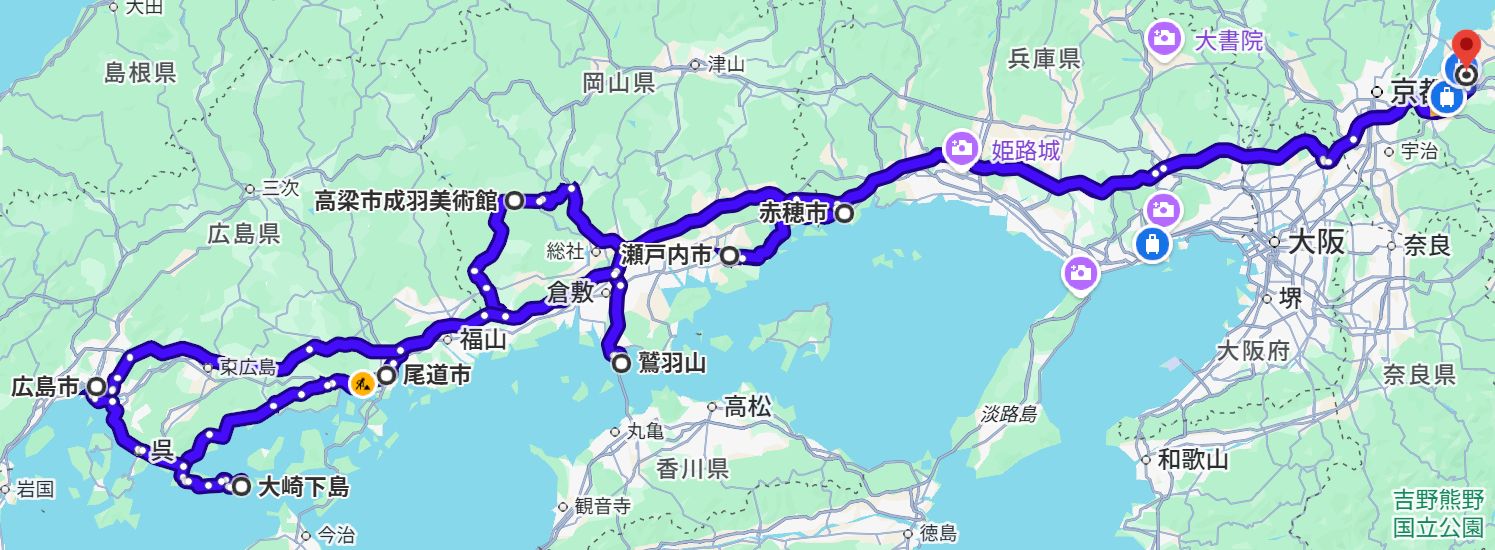 | 福山、広島で魅力的な美術展が開催されることを知り、私にとって初めての山陽道ドライブをしました。行程は約1000km。好天に恵まれ、念願の地も訪問出来て、楽しい旅でした。 1日目:自宅→鷲羽山