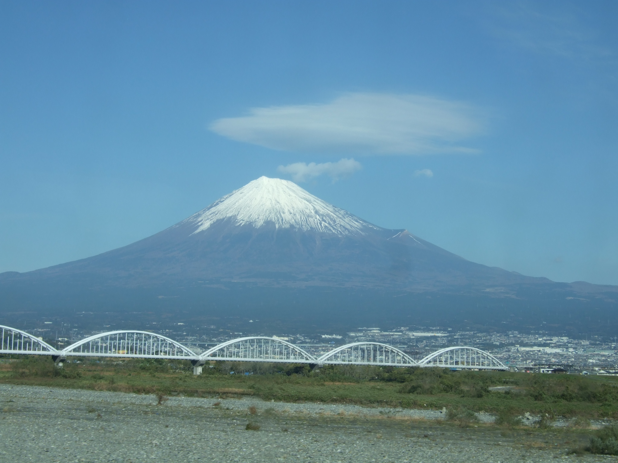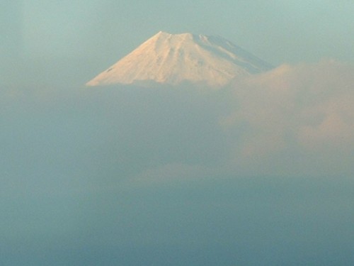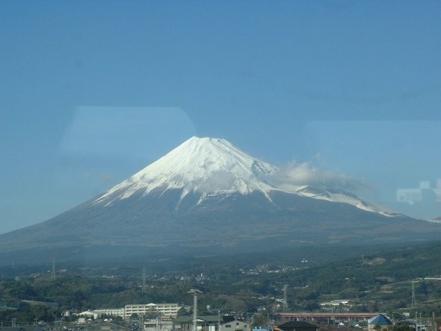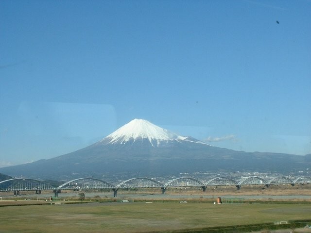 | ■新幹線からの富士(02/03) 新幹線で東京出張する時に、うまくE席に座れ、明るい時刻で、かつ、晴天ならば、富士山を眺めるのが楽しみだ。 特に、雪が被っている秋から早春が美しい。 静岡駅を過ぎたあたりから見え始めるが、シャッターチャンスは富士川鉄橋を渡る時、新富士駅を過ぎてから暫くの間、そして三島駅付近である。 (03/01 追記)静岡駅の手前で、右側に見える。また、平塚〜海老名でも、かなり長い間、平野の向こうに見える。 (03/09 追記)夕暮れ時、東京を出てから小田原まで、黒富士を楽しみました。 (07/01 追記)古いアルバムに1972年1月撮影の写真を見付けました。 |