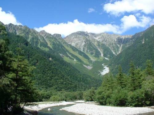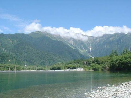 うぐいすの声で目覚める。朝、6時。温泉に入ってから、橋まで、散歩。朝日を浴びた穂高、焼岳を見て、数年前に行ったスイスアルプスを思い出す。あの時も、朝起きたら、快晴で、ほっとした。