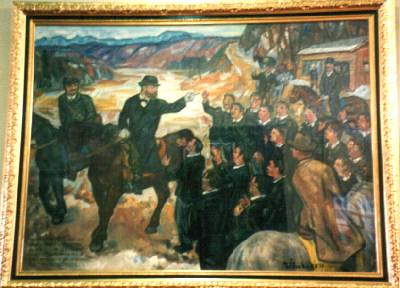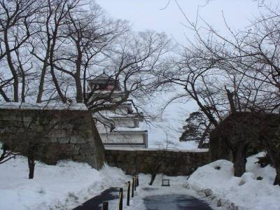 会津若松へ出張し、列車の待ち時間が90分あったので、見学しました。この冬の大雪のため、道路もお堀も雪に埋もれています。お堀ばたの桜の木が立派な老木で、お花見の頃はさぞかしと思われます。案内所前にある「ゴム長靴お貸しします」という看板を見ていたら、ボランティア・ガイドの老婦人に声を掛けられ、ガイドをお願いする。 立派な石垣は、蒲生氏郷(滋賀県=近江の出身)が約400年前に天守閣を築城した時に積んだもの。その城は、明治初期の戊辰戦争で大砲を浴びて破壊され、写真が残るのみ。5層の天守閣は昭和40年に復元されたコンクリート造り。地下の塩蔵の石壁が珍しい。天守閣から会津平野、磐梯山、それに白虎隊ゆかりの飯盛山が望める。 |