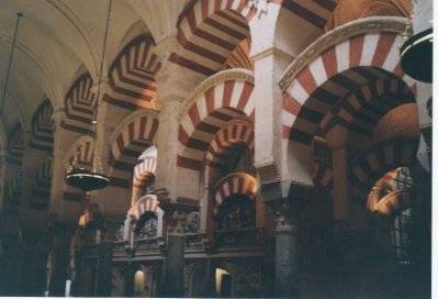 メスキータ(モスク)を見学。 大理石の円柱とアーチが印象的。中央部が後から作られたキリスト教の礼拝堂で、これも美しい。塔は工事中らしく、登れず。土産物店で陶器購入。14時から路地の奥、ブーゲンビリアの花で飾られた洒落たレストランで昼食。白ワイン、野菜スープ、おいしい。 |